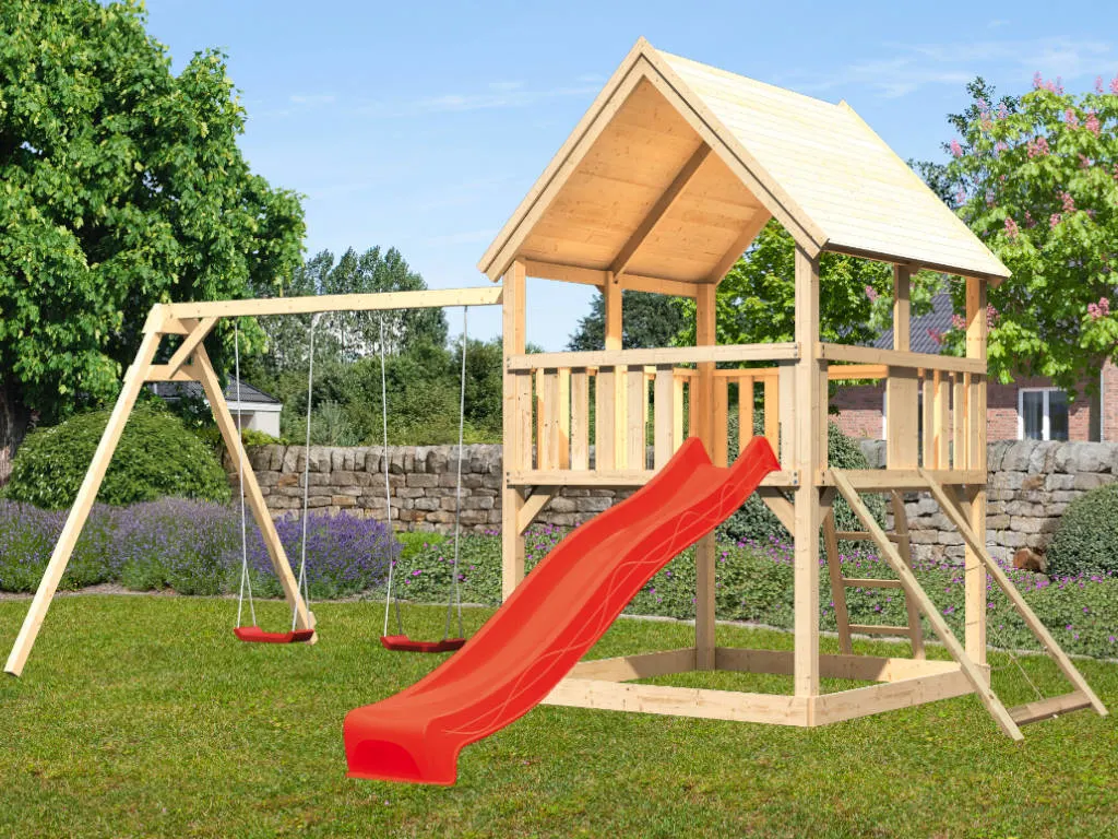 Material: Holz, BxTxH: 200x200x345 cm, inkl. Netzrampe, Doppelschaukel, Rutsche rot