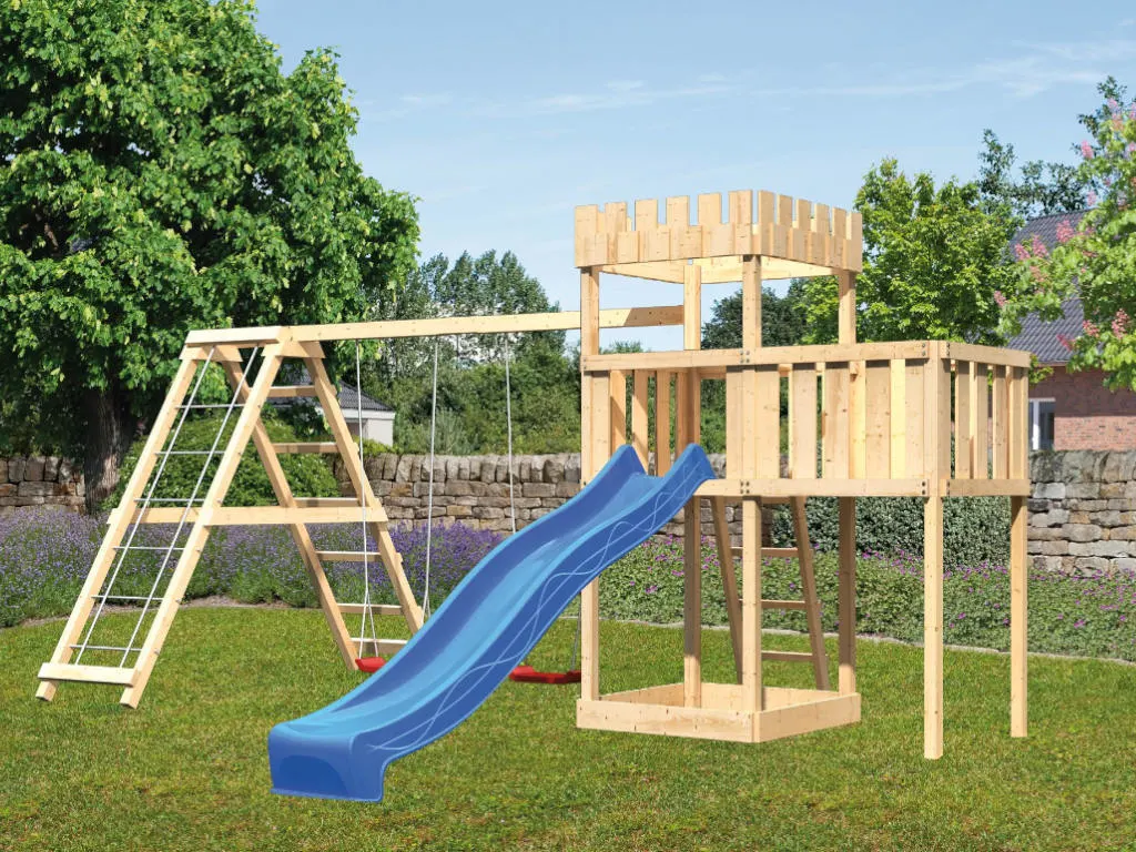 • Spielturm Löwenherz, inkl. Doppelschaukel Klettergerüst, Anbauplattform, Rutsche blau
