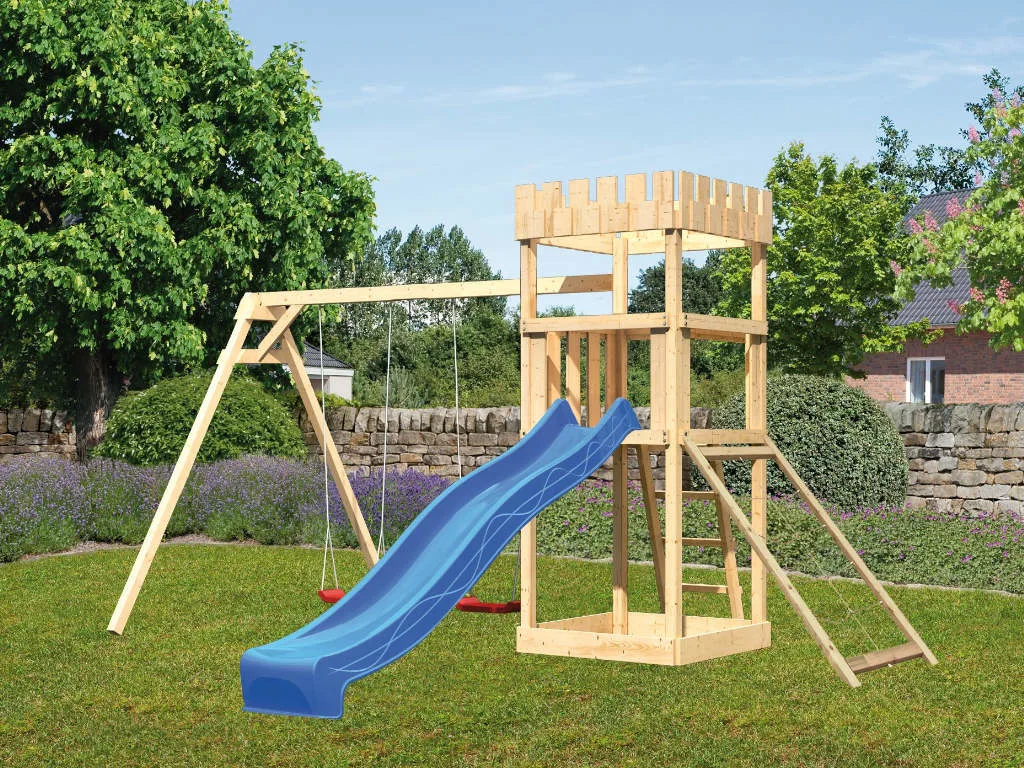 • Spielturm Löwenherz, inkl. Doppelschaukel, Netzrampe, Rutsche blau