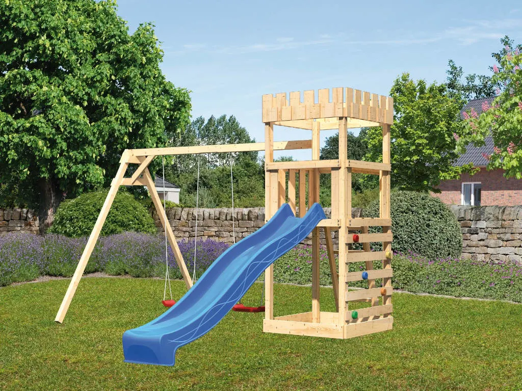 • Spielturm Löwenherz, inkl. Doppelschaukelanbau, Kletterwand, Rutsche blau