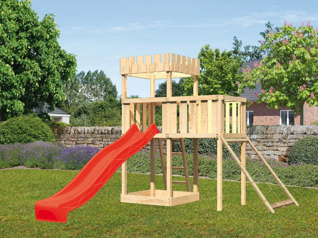 • Spielturm Löwenherz, inkl. Anbauplattform, Netzrampe, Rutsche rot