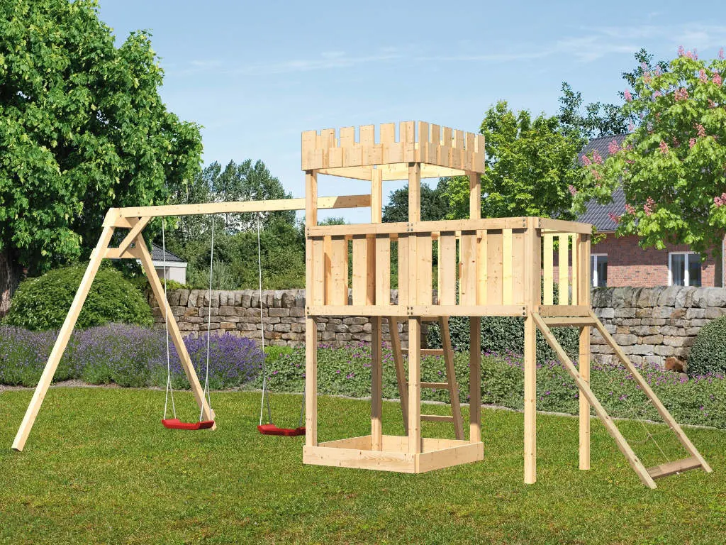 Material: Holz, BxTxH: 107x107x259,5 cm, inkl. Doppelschaukelanbau, Anbauplattform, Netzrampe