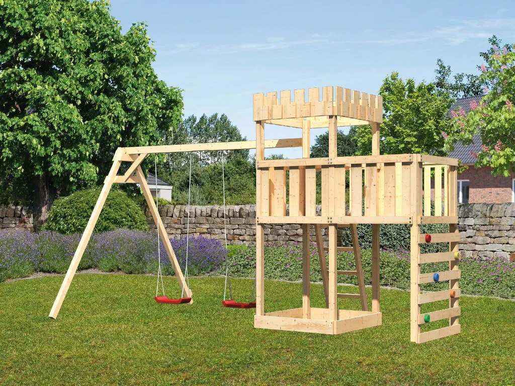 • Spielturm Löwenherz, inkl. Doppelschaukelanbau, Anbauplattform, Netzrampe