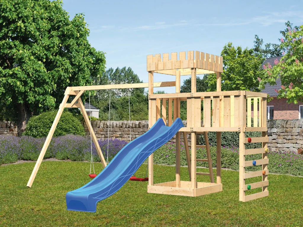• Spielturm Löwenherz, inkl. Doppelschaukelanbau, Anbauplattform, Kletterwand, Rutsche blau