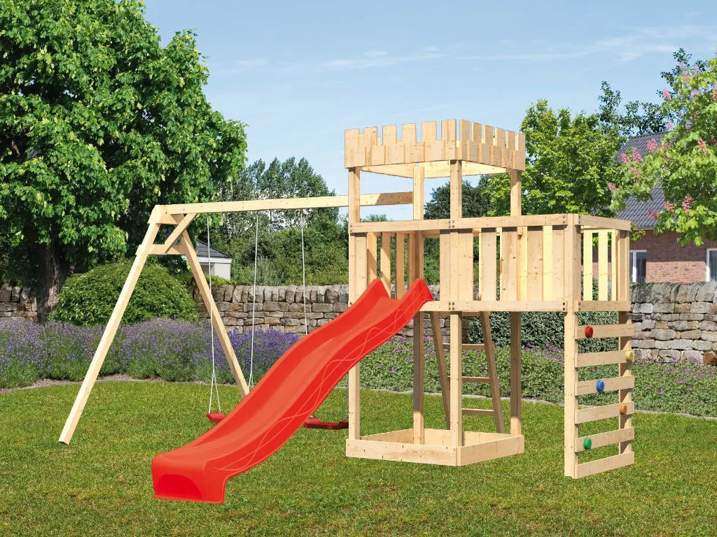 Material: Holz, BxTxH: 107x107x259,5 cm, inkl. Doppelschaukelanbau, Anbauplattform, Kletterwand, Rutsche rot