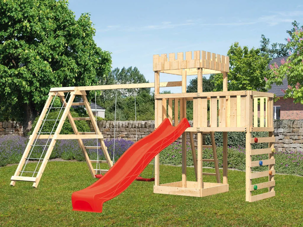 • Spielturm Löwenherz, inkl. Doppels Klettergerüst, Anbauplattform, Kletterwand, Rutsche rot