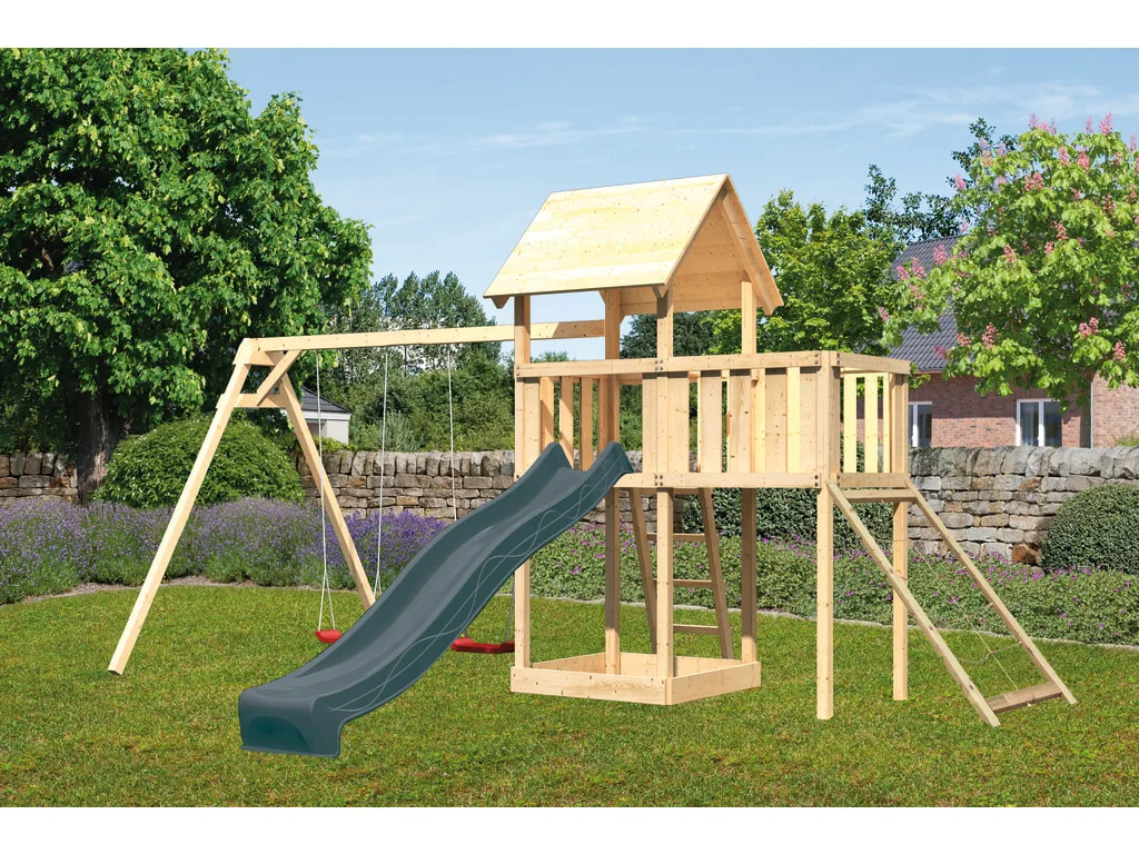 Spielturm Set Lotti naturbelassen inkl. Rutsche anthrazit + Doppelschaukel + Anbauplattform + Netzrampe
