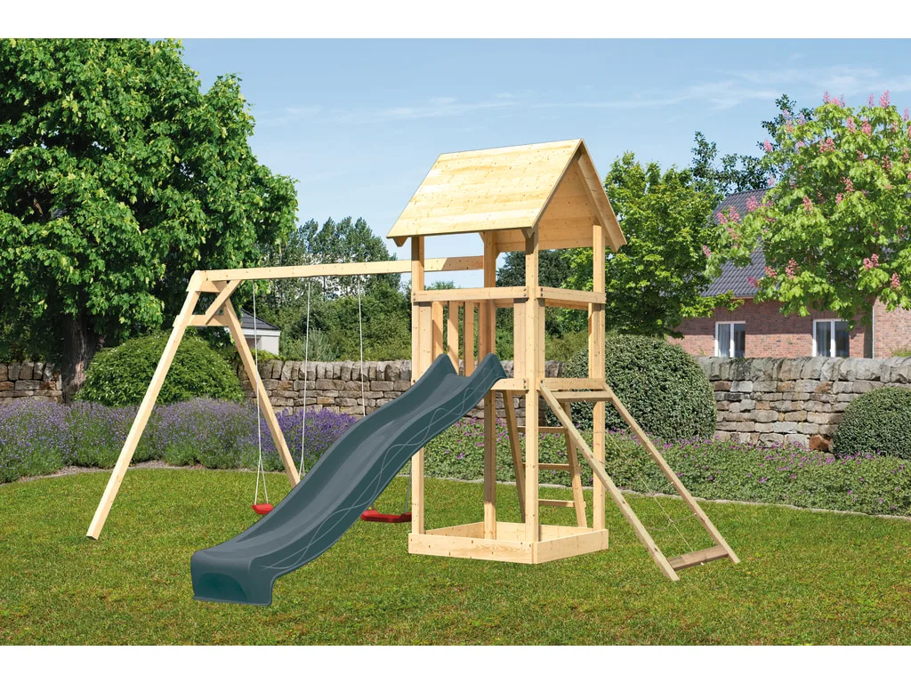 Spielturm Set Lotti naturbelassen inkl. Rutsche anthrazit + Doppelschaukel + Netzrampe
