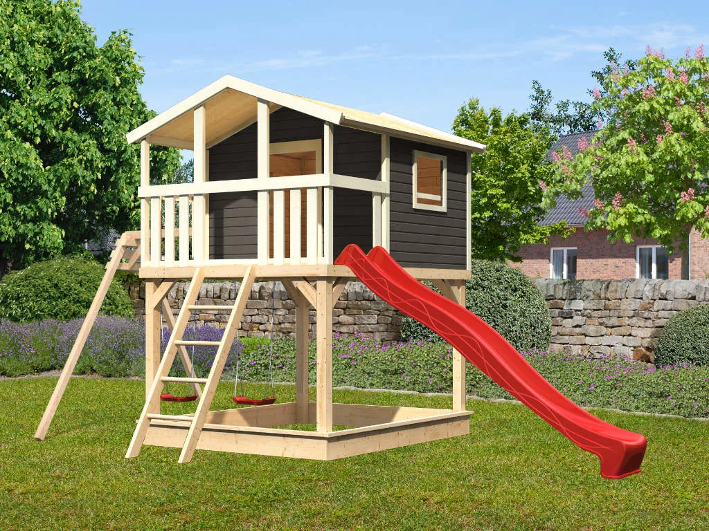 Nicht für Kinder unter 3 Jahren geeignet. Geeignet für Kinder von 3 bis 14 Jahren. Benutzung nur unter unmittelbarer Aufsicht von Erwachsenen. Stolper- und/oder Sturzgefahr. Nur für den häuslichen, privaten Bereich (DIN EN 71-8). Ausschließlich für die Verwendung im Freien. Spieltürme/Stelzenhäuser mit einer Spielhöhe von über 60 cm müssen auf einer weichen Unterlage wie Gras oder Holzspänen aufgestellt werden. Bei Spieltürmen/Stelzenhäusern mit einer Spielhöhe unter 60 cm wird eine weiche Unterlage ebenfalls empfohlen. Die Grundkonstruktion ist in regelmäßigen Abständen auf etwaige Beschädigung und Fäulnisbefall zu kontrollieren. Um die Stabilität zu gewährleisten, müssen die Pfosten im Boden verankert werden. Die Schraubverbindungen sind in regelmäßigen Abständen (ca. 4 Wochen, je nach Benutzungshäufigkeit und Alter des Spielgerätes) auf festen Sitz und Stabilität zu überprüfen. Die angegebenen Maße können geringfügig abweichen.