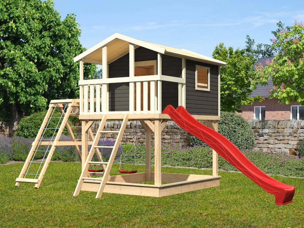 Material: Holz, B x T x H: 198 x 244 x 309 cm, inkl. Doppelschaukelanbau, Klettergerüst, Netzrampe, Wellenrutsche rot, Holzleiter