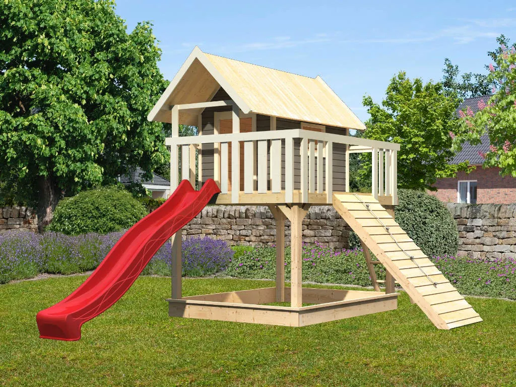 • Stelzenhaus Fidel, inkl. Wellenrutsche 3m rot, Holzrampe