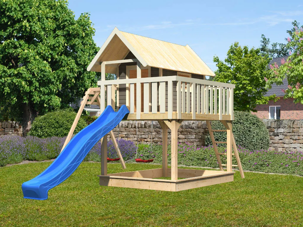 Nicht für Kinder unter 3 Jahren geeignet. Geeignet für Kinder von 3 bis 14 Jahren. Benutzung nur unter unmittelbarer Aufsicht von Erwachsenen. Stolper- und/oder Sturzgefahr. Nur für den häuslichen, privaten Bereich (DIN EN 71-8). Ausschließlich für die Verwendung im Freien. Spieltürme/Stelzenhäuser mit einer Spielhöhe von über 60 cm müssen auf einer weichen Unterlage wie Gras oder Holzspänen aufgestellt werden. Bei Spieltürmen/Stelzenhäusern mit einer Spielhöhe unter 60 cm wird eine weiche Unterlage ebenfalls empfohlen. Die Grundkonstruktion ist in regelmäßigen Abständen auf etwaige Beschädigung und Fäulnisbefall zu kontrollieren. Um die Stabilität zu gewährleisten, müssen die Pfosten im Boden verankert werden. Die Schraubverbindungen sind in regelmäßigen Abständen (ca. 4 Wochen, je nach Benutzungshäufigkeit und Alter des Spielgerätes) auf festen Sitz und Stabilität zu überprüfen. Die angegebenen Maße können geringfügig abweichen.