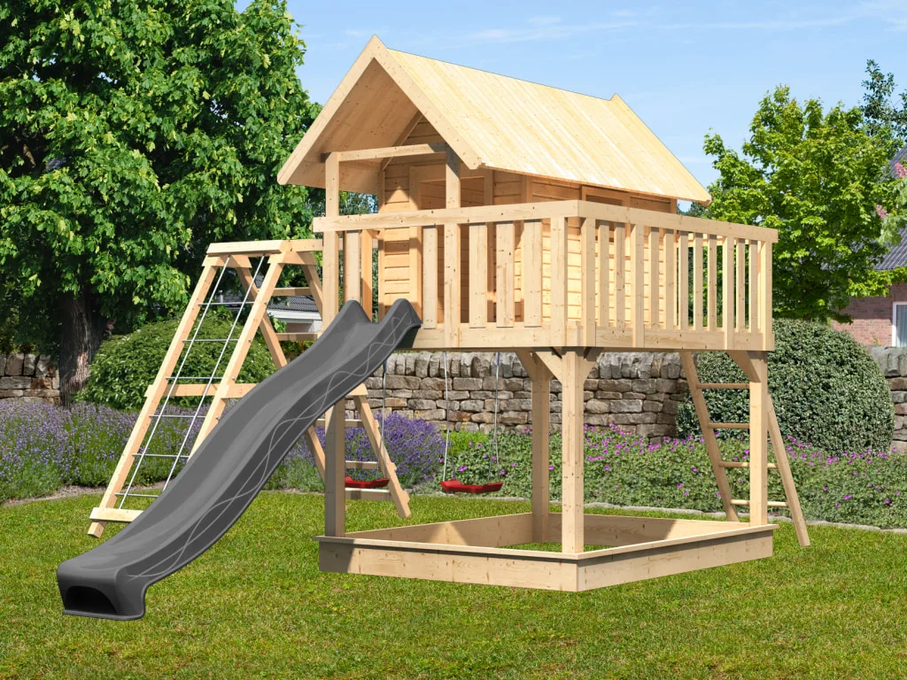 Stelzenhaus SET Fidel naturbelassen inkl. Rutsche anthrazit + Doppelschaukelanbau mit Klettergerüst + Netzrampe