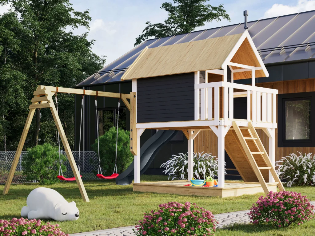 Dieser Spielturm ist aus Holz gefertigt. Der Naturstoff ist das perfekte Material für Kinderspielgeräte – strapazierfähig und beständig. Für die Herstellung wurde erstklassiges Fichtenholz verwendet. Fichte ist besonders langlebig und robust, was für die notwendige Stabilität sorgt. Das Holz ist lackiert und lasiert. Es ist somit bereits gegen Witterung sowie Schädlingsbefall geschützt und bedarf keiner weiteren Nachbehandlung.