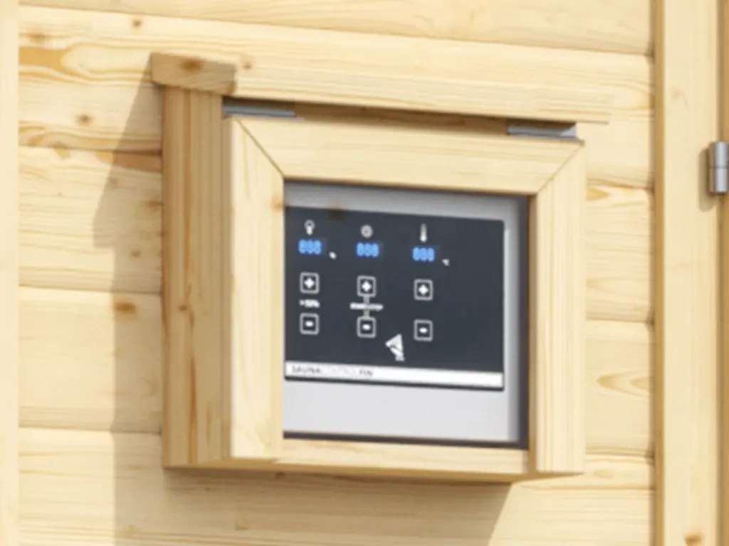 Gefertigt aus naturbelassenem Holz, fügt sich die Verkleidung dezent in den Außenbereich ein und passt optisch ideal zu klassischen und modernen Saunaanlagen. Sie eignet sich besonders für die Installation von Steuergeräten außerhalb der Saunakabine, etwa bei Außen- oder Gartensaunen.
