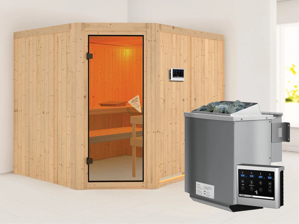 Bei dieser Innensauna ist ein Saunaofen mit einer externen Steuerung inklusive. Das Steuergerät wird außerhalb der Sauna angebracht. Auf diese Weise fängt schon vor dem Saunieren der Komfort an – mit einer bequemen Bedienung von außen und einer noch exakteren Temperatureinstellung. Weitere elektrische Geräte, wie die Kabinenbeleuchtung, können ebenso an die externe Steuerung angeschlossen und bedient werden.