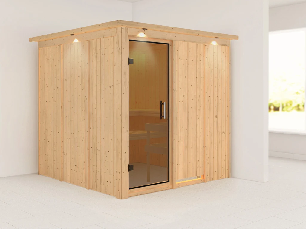 3 Liegen, 1 Kopfstütze aus Espenholz, Ofenschutzgitter aus stabilem Fichtenholz, Dachkranz inkl. 3 LED-Strahlern á 7, 5 Watt, Montageanleitung.