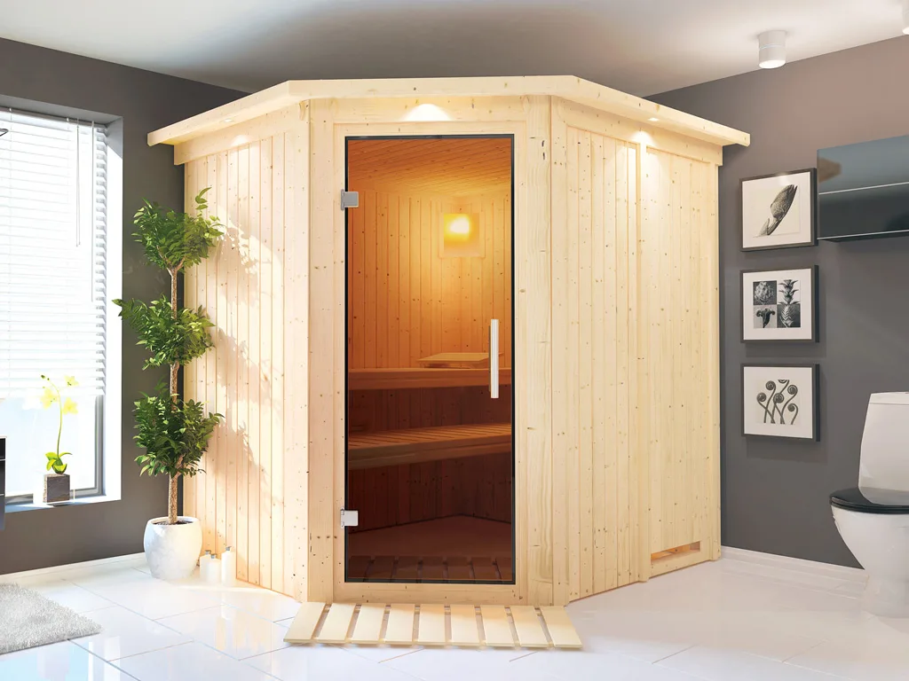 Bei der Montage einer Sauna muss ein Mindestabstand von 10 cm zu Wänden und Decke unbedingt eingehalten werden, um gute Luftzirkulation zu gewährleisten. So kann feucht-warme Luft besser abziehen. In diesem Zusammenhang müssen die Mindestraumhöhe und -breite beachtet werden.