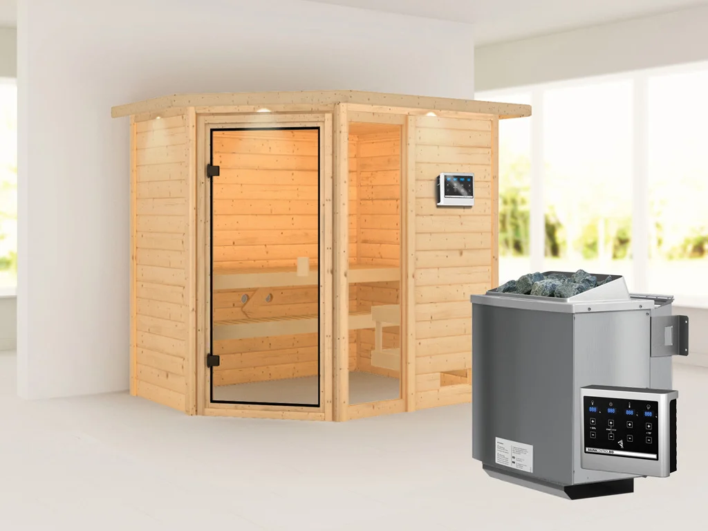 Bei dieser Innensauna ist ein Saunaofen mit einer externen Steuerung inklusive. Das Steuergerät wird außerhalb der Sauna angebracht. Auf diese Weise fängt schon vor dem Saunieren der Komfort an – mit einer bequemen Bedienung von außen und einer noch exakteren Temperatureinstellung. Weitere elektrische Geräte, wie die Kabinenbeleuchtung, können ebenso an die externe Steuerung angeschlossen und bedient werden.