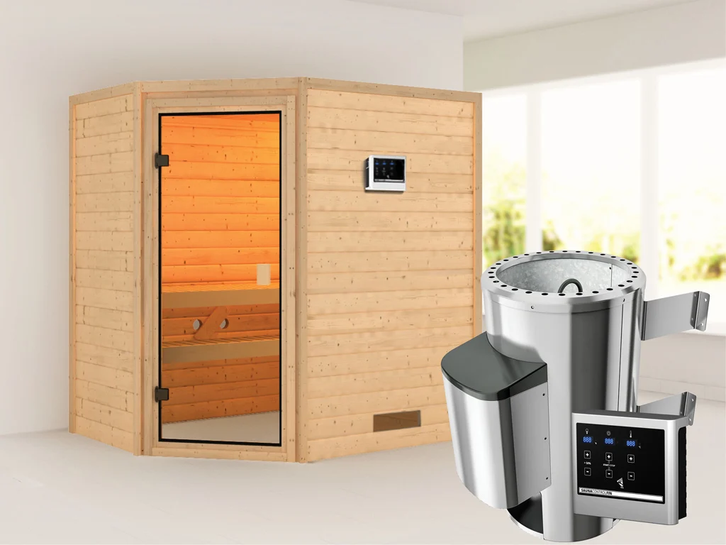 Diese Innensauna wird mit Saunaofen und einer externen Steuerung geliefert. Die Anbringung des Steuergerätes erfolgt an der Außenseite der Sauna. Ganz komfortabel kann somit die Saunasteuerung von außen erledigt und die Temperatur exakt bestimmt werden. Zusätzlich verfügt das Steuergerät über eine Anschlussstelle, über die ein weiteres elektrisches Gerät bedient werden kann.