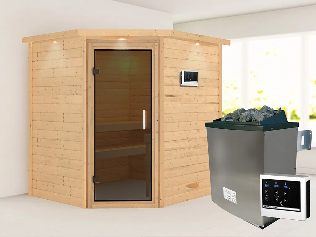 Sauna Massivholzsauna Mia mit Dachkranz, inkl. 9 kW Ofen mit externer Steuerung