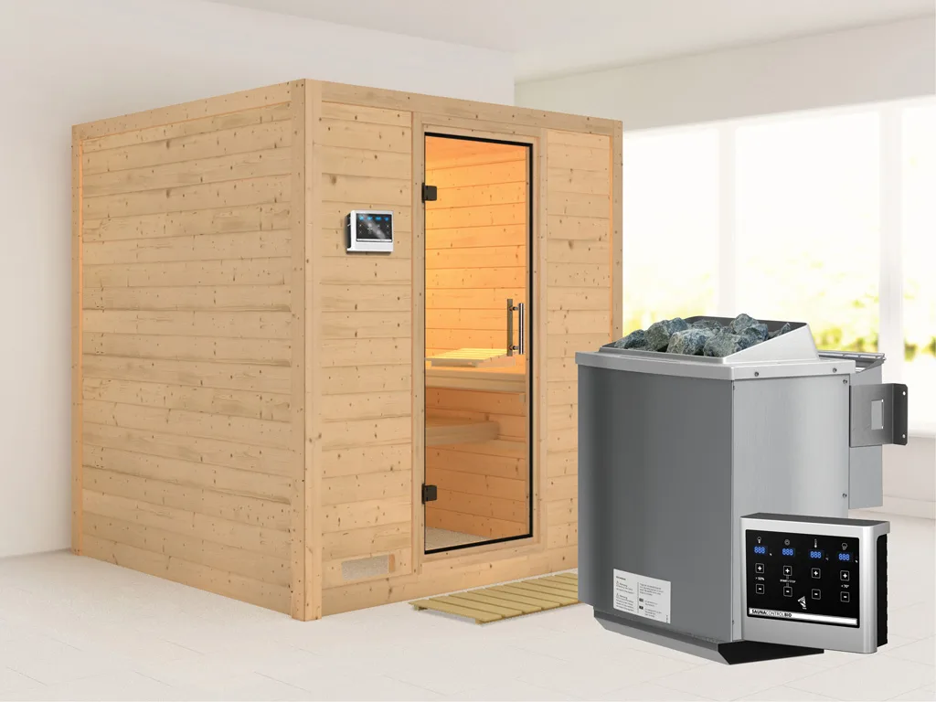 Sauna Massivholzsauna Mojave Klarglas Ganzglastür + 9 kW Bio-Kombiofen mit ext.Strg