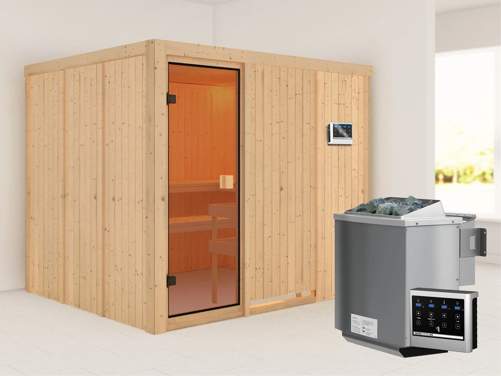 Sauna Nybro mit bronzierter Glastür + 9 kW Bio-Kombiofen mit ext. Strg.
