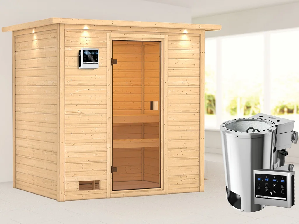 Bei dieser Innensauna ist ein Saunaofen mit einer externen Steuerung inklusive. Das Steuergerät wird außerhalb der Sauna angebracht. Auf diese Weise fängt schon vor dem Saunieren der Komfort an – mit einer bequemen Bedienung von außen und einer noch exakteren Temperatureinstellung. Weitere elektrische Geräte, wie die Kabinenbeleuchtung, können ebenso an die externe Steuerung angeschlossen und bedient werden.