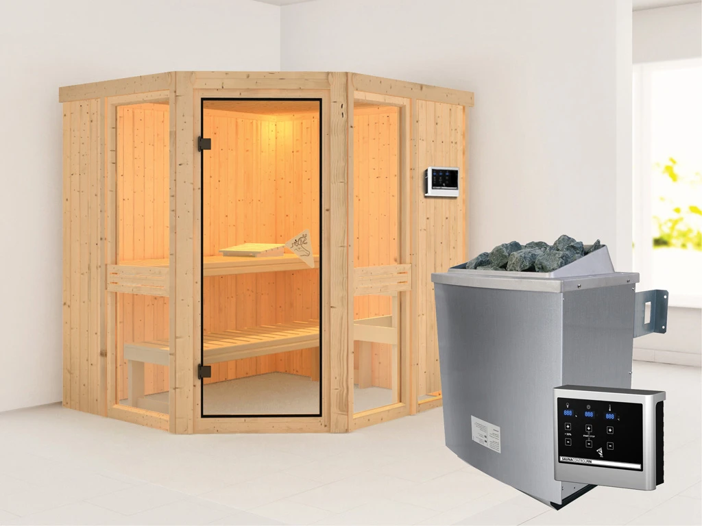 Bei dieser Innensauna ist ein Saunaofen mit einer externen Steuerung inklusive. Das Steuergerät wird außerhalb der Sauna angebracht. Auf diese Weise fängt schon vor dem Saunieren der Komfort an – mit einer bequemen Bedienung von außen und einer noch exakteren Temperatureinstellung. Weitere elektrische Geräte, wie die Kabinenbeleuchtung, können ebenso an die externe Steuerung angeschlossen und bedient werden.