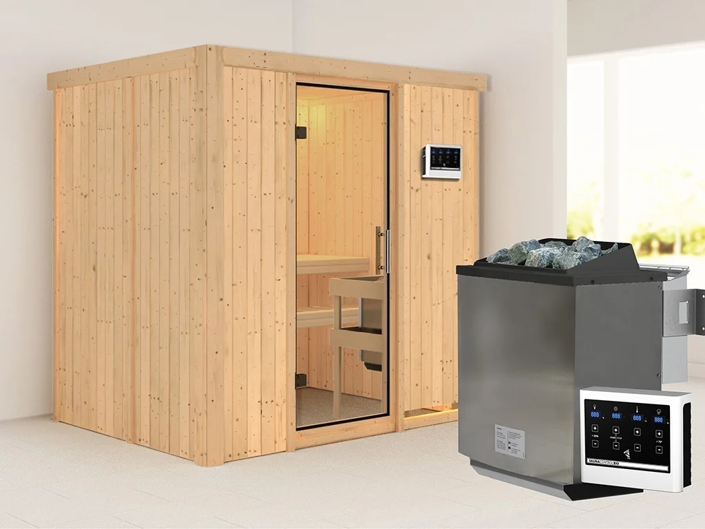 Unsere Wellnessartikel (Saunen, Saunahäuser, Saunafässer, Kotas, Infrarotkabinen, Saunaöfen etc.) dürfen nur für den privathäuslichen Gebrauch verwendet werden! Saunaöfen und dazugehörige Steuerelemente dürfen nur durch einen örtlich zugelassenen Elektroinstallateur mittels festem Anschluss an das Netz angeschlossen werden. Ausnahme: 230 Volt Plug-&-Play-Saunaöfen. Die Mindestsicherheitsabstände vom Ofen zur Wand und vom Ofen zum Ofenschutz müssen unbedingt eingehalten werden. Bei 9-kW-Öfen muss die Höhe des Ofenschutzes angepasst werden. Bitte beachte zu den obig genannten Hinweisen die beigefügten Montageanleitungen.
