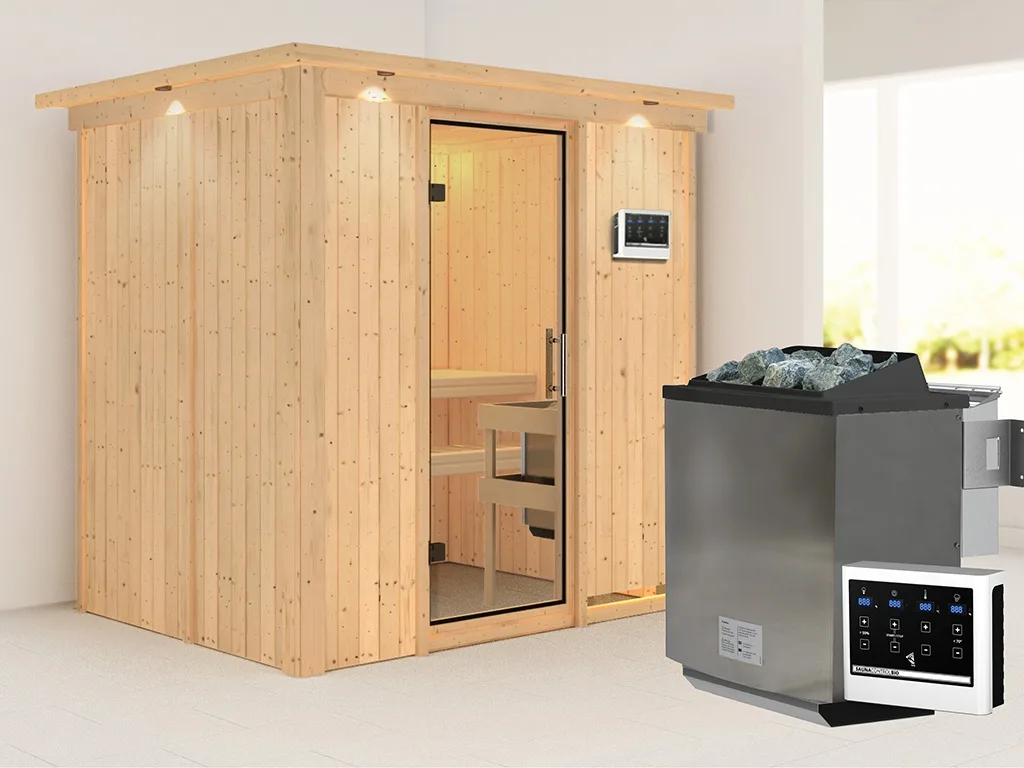 Sauna Systemsauna Bodin mit Dachkranz, inkl. 9 kW Bio-Ofen mit externer Steuerung