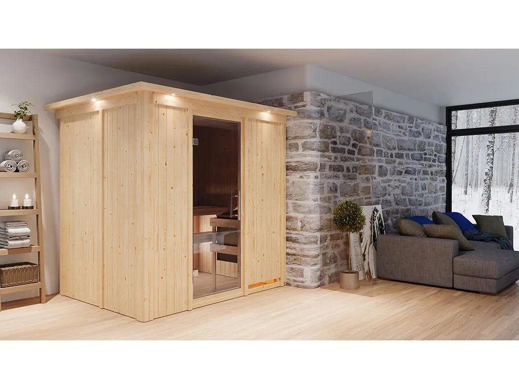 Sauna Systemsauna Bodin mit Dachkranz, inkl. 9 kW Ofen mit integrierter Steuerung