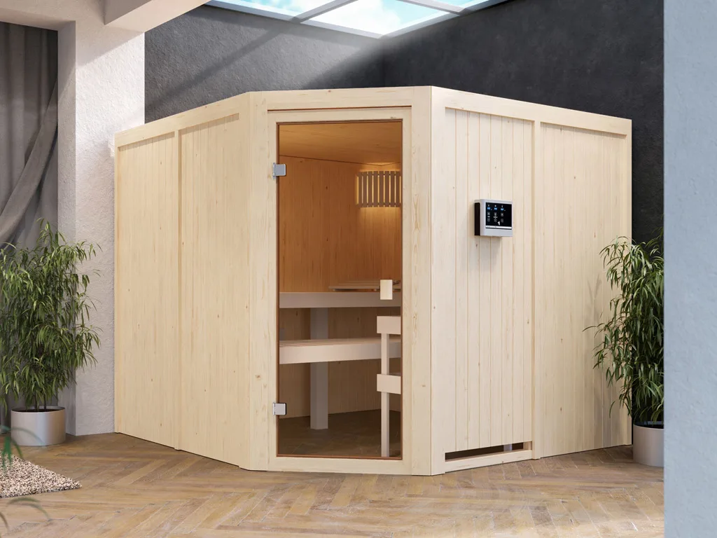 Die Lieferung der Sauna erfolgt ohne Saunaofen und -steuerung. Diese können in unserem Online Shop separat erworben werden. Falls Du Dich nicht für einen Ofen mit integrierter Steuerung entscheidest, kannst Du eine externe Steuerung kaufen. Diese ist praktisch außerhalb der Sauna bedienbar und verfügt über vielseitige Einstellungsmöglichkeiten.