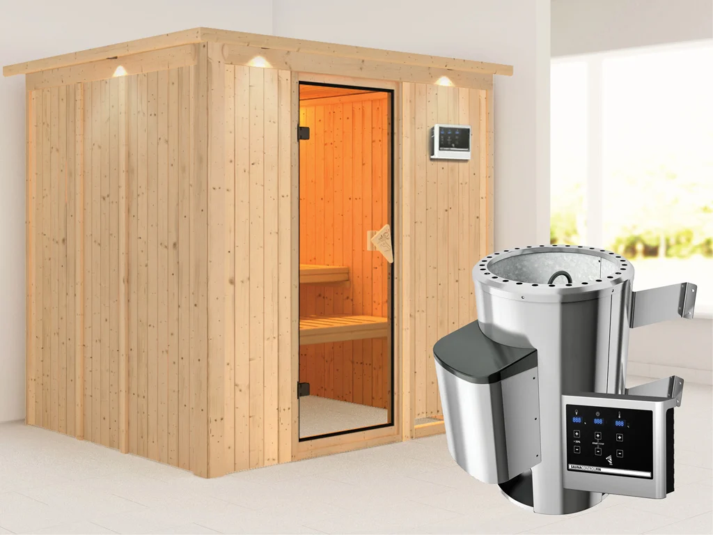 Diese Innensauna wird einschließlich Saunaofen mit externer Steuerung geliefert. Die Anbringung an der Außenseite der Sauna ermöglicht eine praktische Bedienung vor dem Saunieren und eine noch exaktere Einstellung der Temperatur. Weitere elektrische Geräte, wie eine Kabinenbeleuchtung, können ebenso an die externe Steuerung angeschlossen und mit dieser bedient werden.