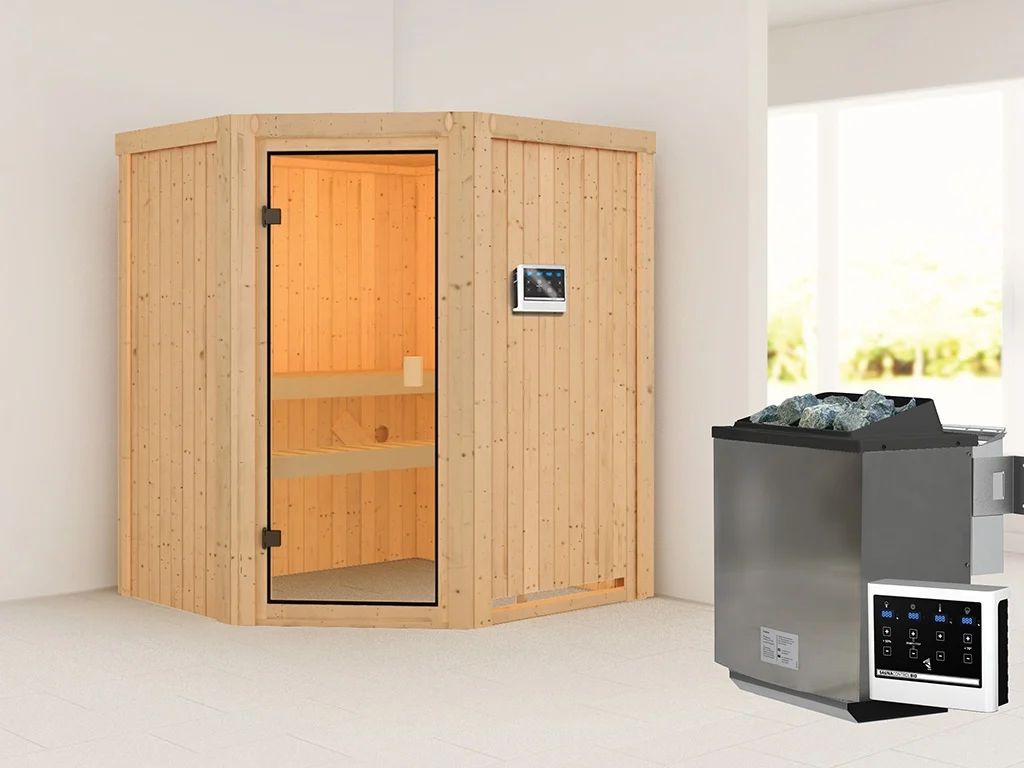 Unsere Wellnessartikel (Saunen, Saunahäuser, Saunafässer, Kotas, Infrarotkabinen, Saunaöfen etc.) dürfen nur für den privathäuslichen Gebrauch verwendet werden! Saunaöfen und dazugehörige Steuerelemente dürfen nur durch einen örtlich zugelassenen Elektroinstallateur mittels festem Anschluss an das Netz angeschlossen werden. Ausnahme: 230 Volt Plug-&-Play-Saunaöfen. Die Mindestsicherheitsabstände vom Ofen zur Wand und vom Ofen zum Ofenschutz müssen unbedingt eingehalten werden. Bei 9-kW-Öfen muss die Höhe des Ofenschutzes angepasst werden. Bitte beachte zu den obig genannten Hinweisen die beigefügten Montageanleitungen.