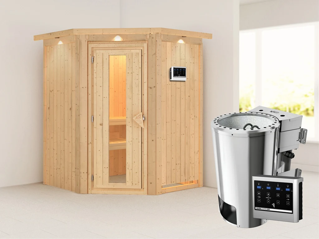Diese Innensauna wird einschließlich Saunaofen mit externer Steuerung geliefert. Die Anbringung an der Außenseite der Sauna ermöglicht eine praktische Bedienung vor dem Saunieren und eine noch exaktere Einstellung der Temperatur. Weitere elektrische Geräte, wie eine Kabinenbeleuchtung, können ebenso an die externe Steuerung angeschlossen und mit dieser bedient werden.