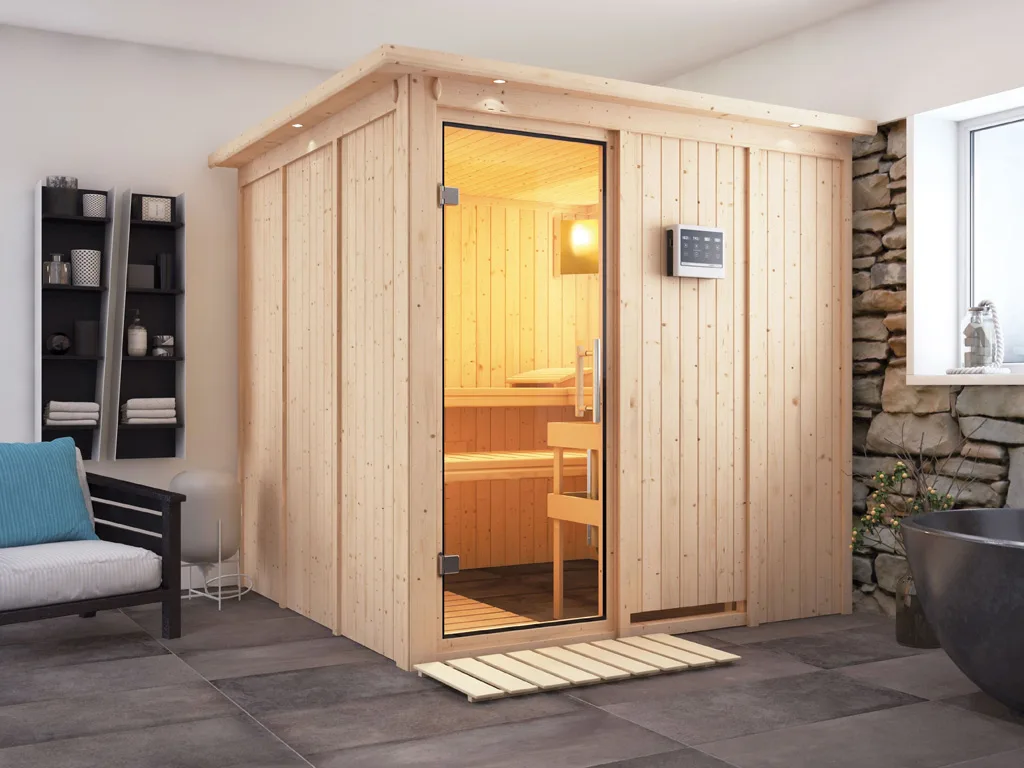 Diese Innensauna wird einschließlich Saunaofen mit externer Steuerung geliefert. Die Anbringung an der Außenseite der Sauna ermöglicht eine praktische Bedienung vor dem Saunieren und eine noch exaktere Einstellung der Temperatur. Weitere elektrische Geräte, wie eine Kabinenbeleuchtung, können ebenso an die externe Steuerung angeschlossen und mit dieser bedient werden.