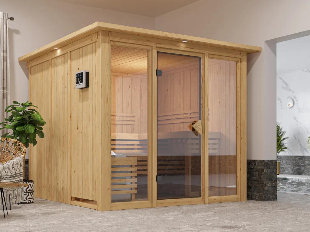 Dieses Saunamodell – eine System- bzw. Elementsauna – zeichnet sich durch seine besondere Sandwich-Bauweise aus, d. h., die Wandelemente bestehen aus einzelnen Schichten. Die bereits vorgefertigten Wandelemente aus Fichte ermöglichen einen schnellen Aufbau innerhalb weniger Stunden. Mit einer Wandstärke von 68 mm sind Systemsaunen optimal isoliert und somit besonders energiesparend. Wegen der sehr gut gedämmten Elemente heizt sich die Systemsauna extra schnell auf.