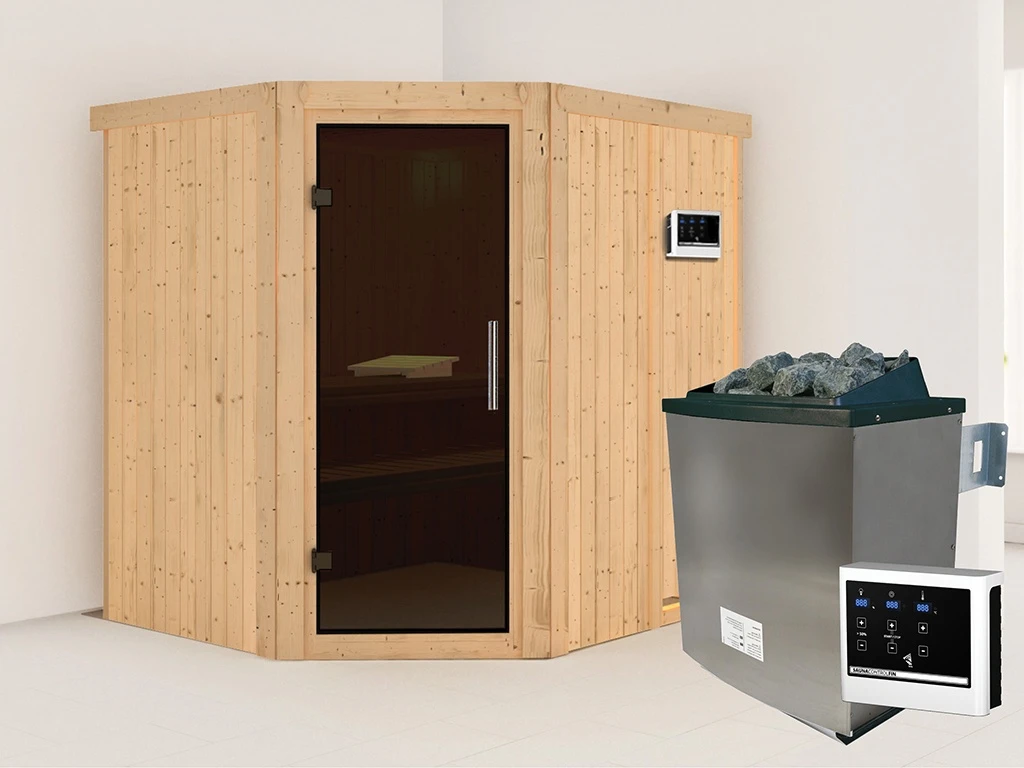 Unsere Wellnessartikel (Saunen, Saunahäuser, Saunafässer, Kotas, Infrarotkabinen, Saunaöfen etc.) dürfen nur für den privathäuslichen Gebrauch verwendet werden! Saunaöfen und dazugehörige Steuerelemente dürfen nur durch einen örtlich zugelassenen Elektroinstallateur mittels festem Anschluss an das Netz angeschlossen werden. Ausnahme: 230 Volt Plug-&-Play-Saunaöfen. Die Mindestsicherheitsabstände vom Ofen zur Wand und vom Ofen zum Ofenschutz müssen unbedingt eingehalten werden. Bei 9-kW-Öfen muss die Höhe des Ofenschutzes angepasst werden. Bitte beachte zu den obig genannten Hinweisen die beigefügten Montageanleitungen.