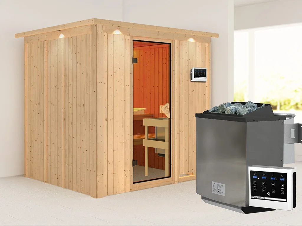 Sauna Systemsauna Sodin mit Dachkranz, inkl. 9 kW Bio-Ofen mit externer Steuerung
