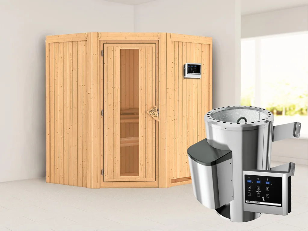 Diese Innensauna wird mit Saunaofen und einer externen Steuerung geliefert. Die Anbringung des Steuergerätes erfolgt an der Außenseite der Sauna. Ganz komfortabel kann somit die Saunasteuerung von außen erledigt und die Temperatur exakt bestimmt werden. Zusätzlich verfügt das Steuergerät über eine Anschlussstelle, über die ein weiteres elektrisches Gerät bedient werden kann.
