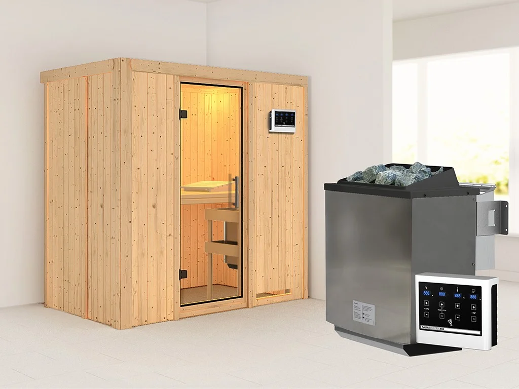 Unsere Wellnessartikel (Saunen, Saunahäuser, Saunafässer, Kotas, Infrarotkabinen, Saunaöfen etc.) dürfen nur für den privathäuslichen Gebrauch verwendet werden! Saunaöfen und dazugehörige Steuerelemente dürfen nur durch einen örtlich zugelassenen Elektroinstallateur mittels festem Anschluss an das Netz angeschlossen werden. Ausnahme: 230 Volt Plug-&-Play-Saunaöfen. Die Mindestsicherheitsabstände vom Ofen zur Wand und vom Ofen zum Ofenschutz müssen unbedingt eingehalten werden. Bei 9-kW-Öfen muss die Höhe des Ofenschutzes angepasst werden. Bitte beachte zu den obig genannten Hinweisen die beigefügten Montageanleitungen.