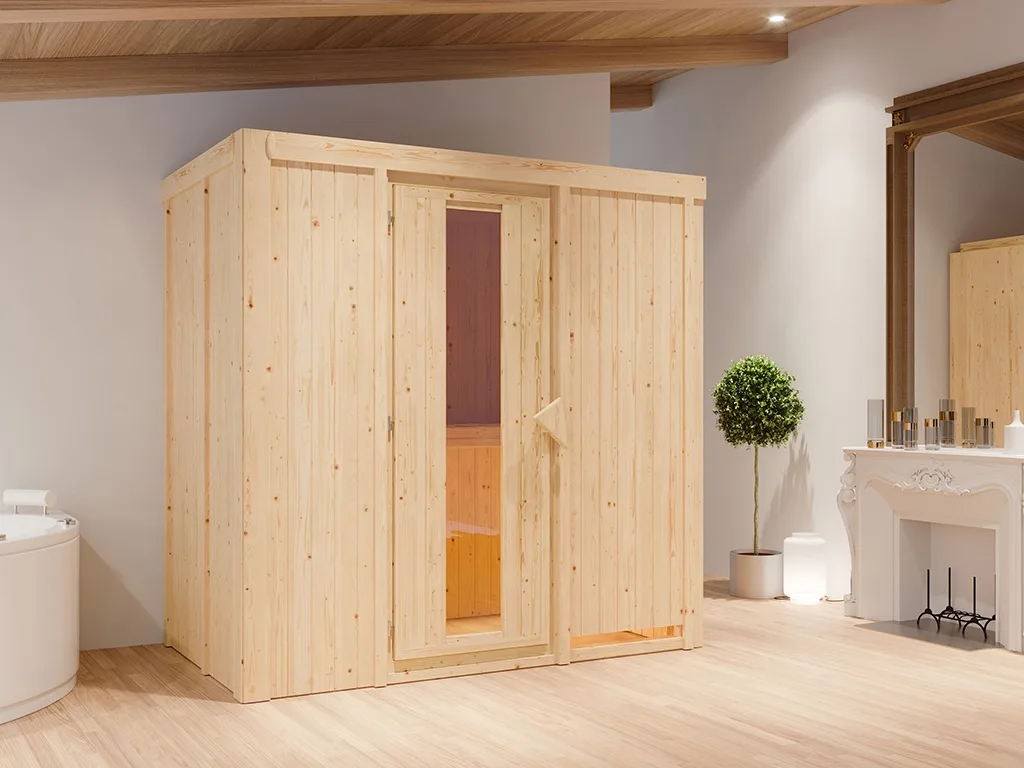 Dieses Saunamodell – eine System- bzw. Elementsauna – zeichnet sich durch seine besondere Sandwich-Bauweise aus, d. h., die Wandelemente bestehen aus einzelnen Schichten. Die bereits vorgefertigten Wandelemente aus Fichte ermöglichen einen schnellen Aufbau innerhalb weniger Stunden. Mit einer Wandstärke von 68 mm sind Systemsaunen optimal isoliert und somit besonders energiesparend. Wegen der sehr gut gedämmten Elemente heizt sich die Systemsauna extra schnell auf.