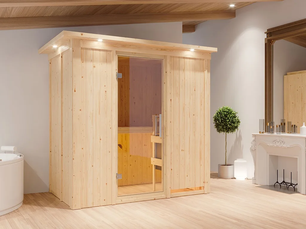 Dieses Saunamodell – eine System- bzw. Elementsauna – zeichnet sich durch seine besondere Sandwich-Bauweise aus, d. h., die Wandelemente bestehen aus einzelnen Schichten. Die bereits vorgefertigten Wandelemente aus Fichte ermöglichen einen schnellen Aufbau innerhalb weniger Stunden. Mit einer Wandstärke von 68 mm sind Systemsaunen optimal isoliert und somit besonders energiesparend. Wegen der sehr gut gedämmten Elemente heizt sich die Systemsauna extra schnell auf.