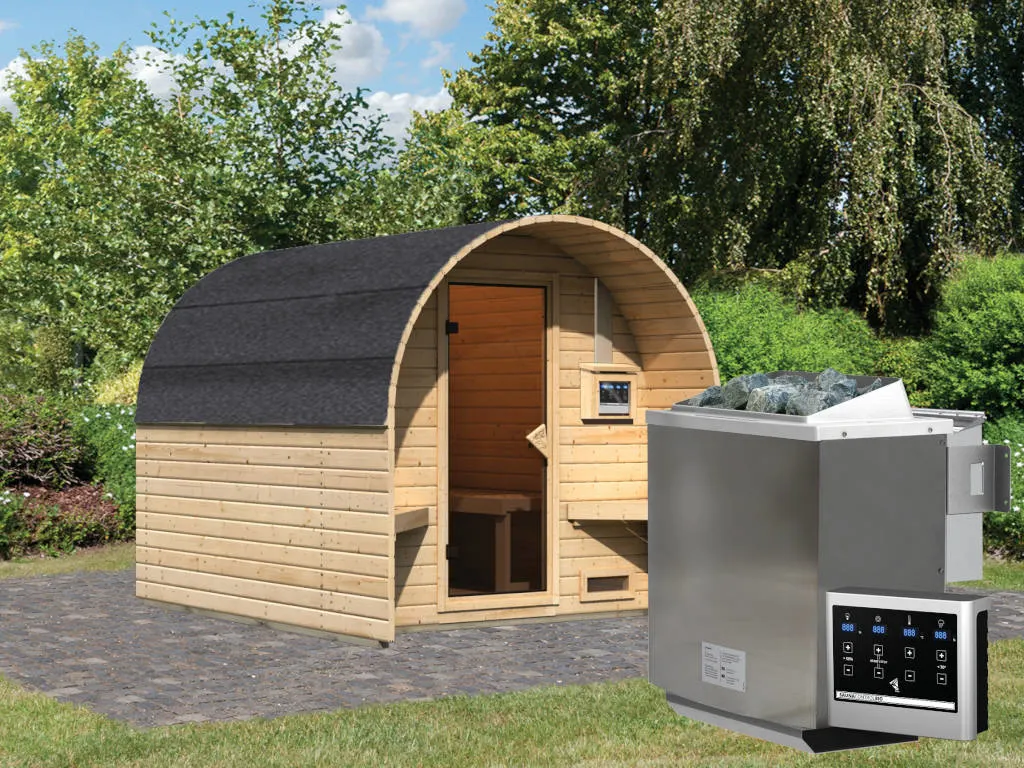 Diese Innensauna wird einschließlich Saunaofen mit externer Steuerung geliefert. Die Anbringung an der Außenseite der Sauna ermöglicht eine praktische Bedienung vor dem Saunieren und eine noch exaktere Einstellung der Temperatur. Weitere elektrische Geräte, wie eine Kabinenbeleuchtung, können ebenso an die externe Steuerung angeschlossen und mit dieser bedient werden.