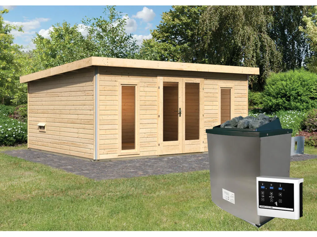 | Lieferumfang | Saunahaus Mainburg 5, 2 Liegebänke, Steuergerät Easy Traditionell, klassischer Saunaofen, Massivholzboden, Unterkonstruktionshölzer, Zylinderschloss mit 3 Schlüsseln, Ofenschutzgitter aus Fichte |