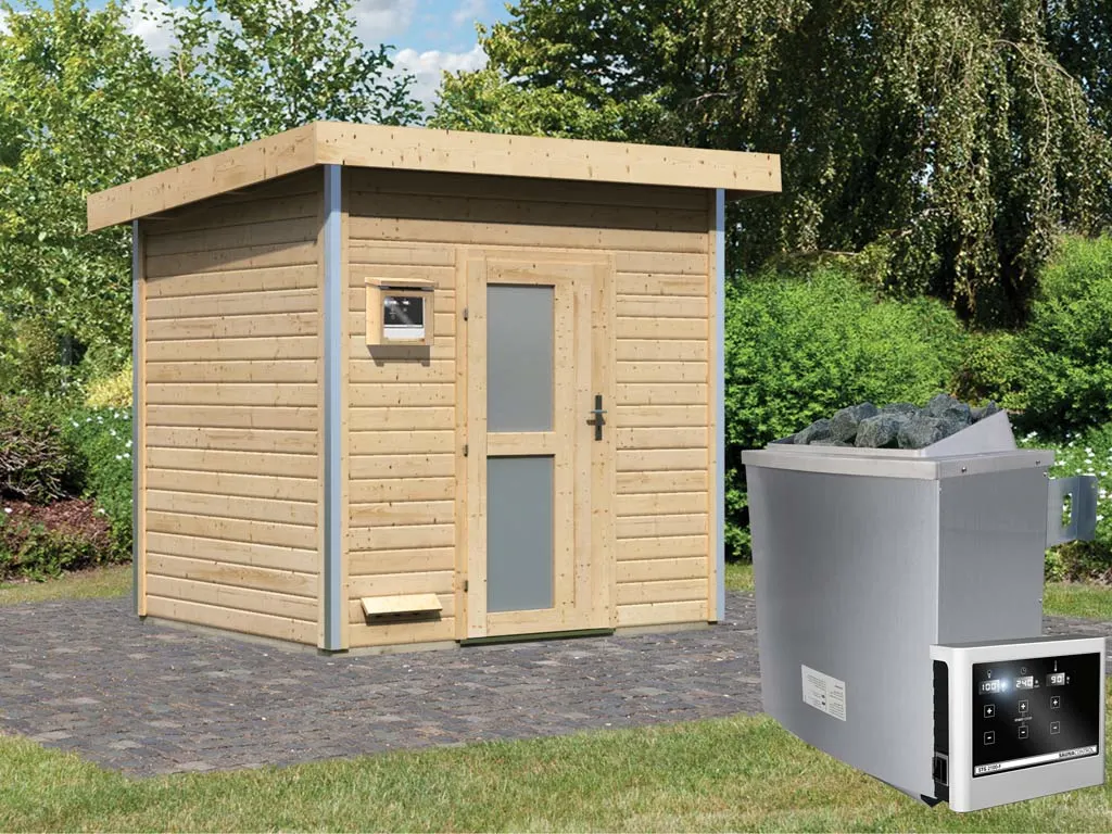 Saunahaus Norge mit Milchglastür, inkl. 9 kW Saunaofen mit externer Steuerung