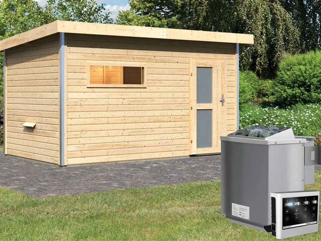 KARIBU Saunahaus "Skrollan 3" 38 mm inkl. 9 kW Bio-Kombiofen mit externer Steuerung "Easy"