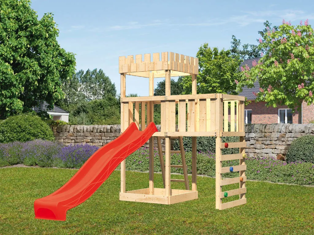 • Spielturm Löwenherz, inkl. Anbauplattform, Kletterwand, Rutsche rot