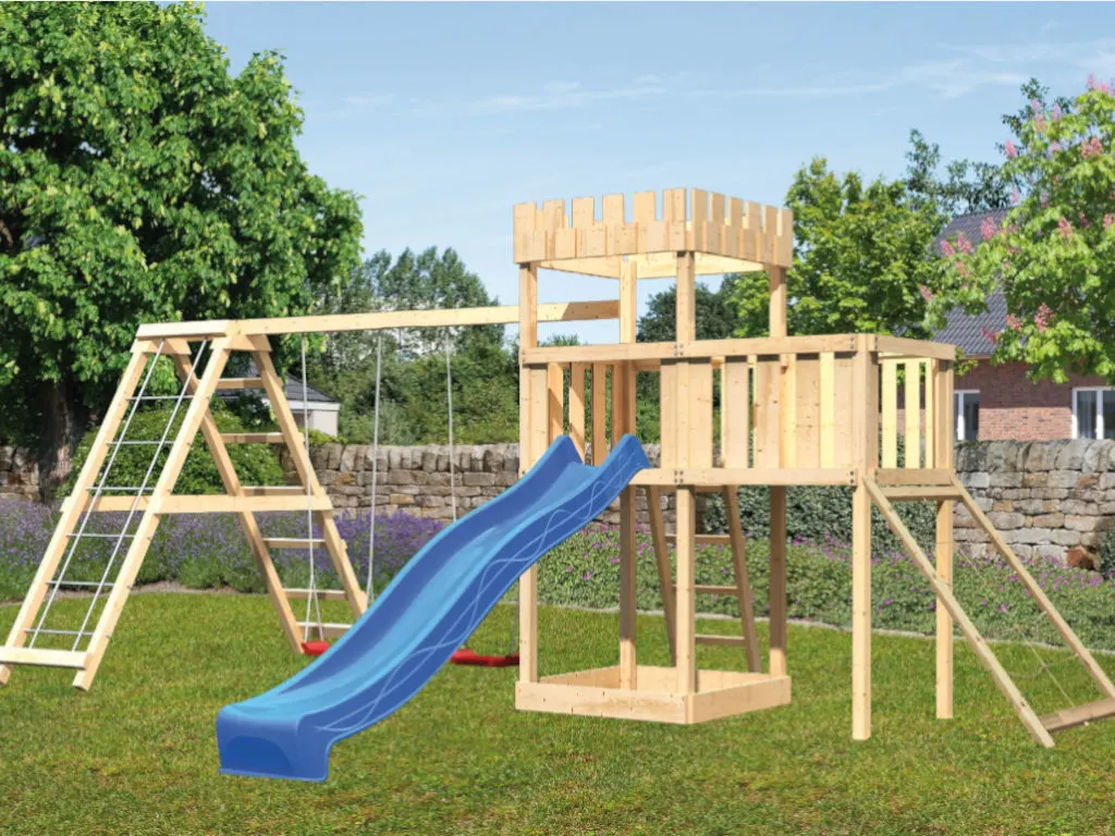 Material: Holz, BxTxH:107x107x259,5cm, inkl. Doppelschaukel, Klettergerüst, Anbauplattform, Netzrampe, Rutsche blau